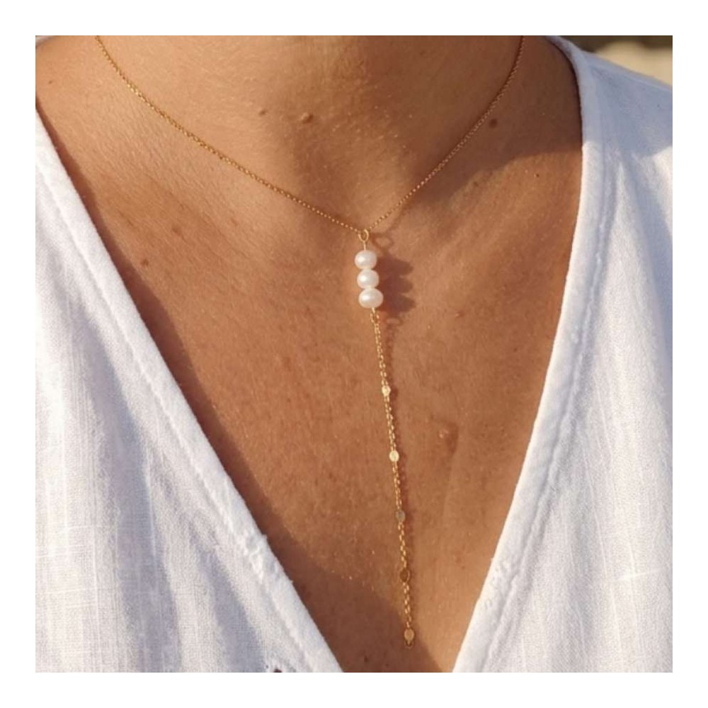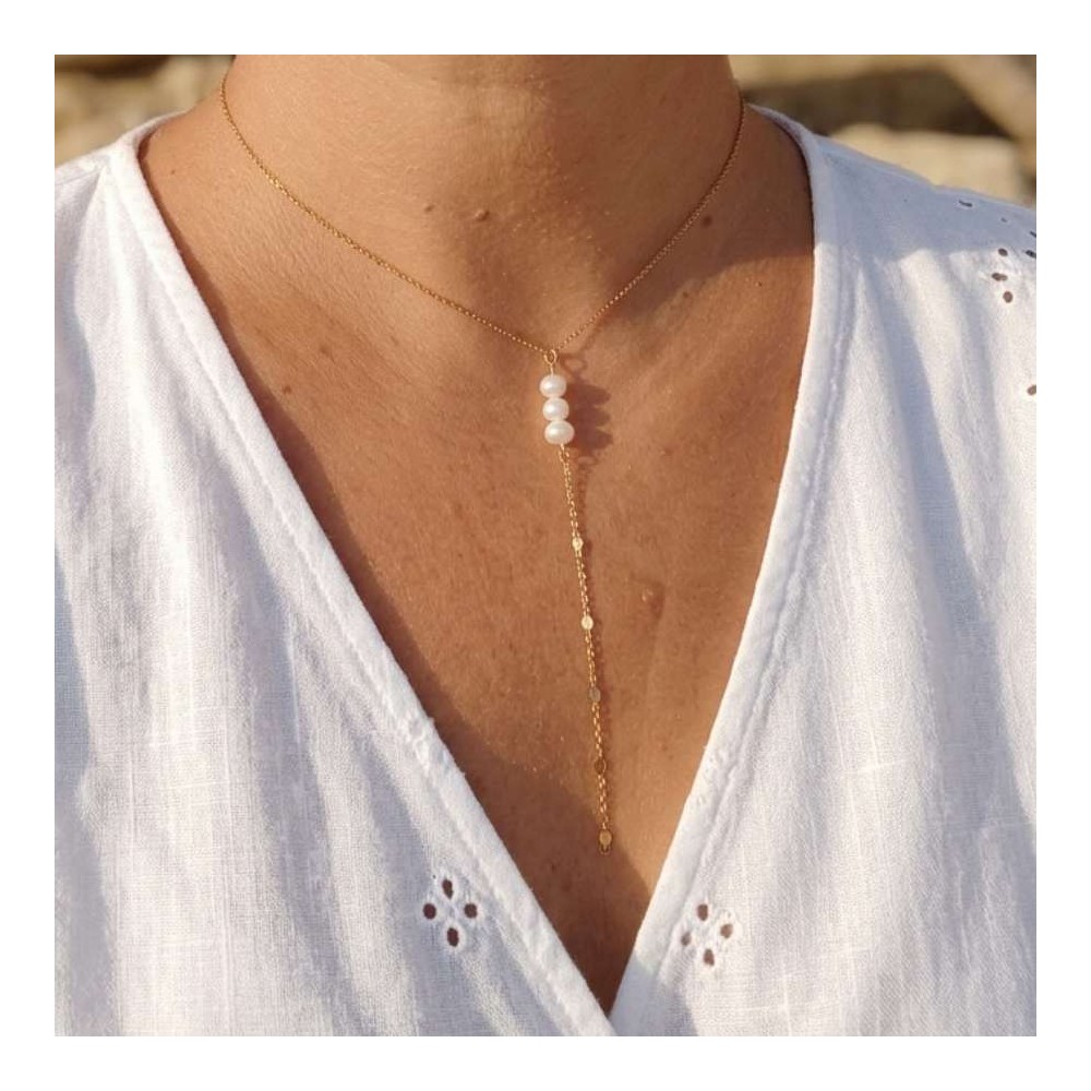 Des perles d'eau douce ornent ce collier fin à la forme originale de Y, ou collier cravate.
