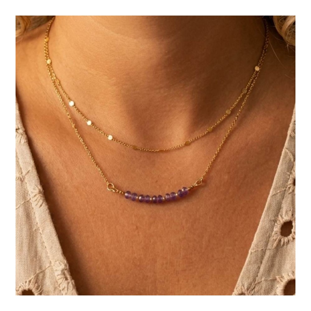 Ce collier artisanal se compose d'une délicate chaîne en acier inoxydable doré parsemée de petits disques étincelants et d'un rang inférieur orné d'améthystes aux teintes violettes captivantes. Sa structure légère et son design épuré mettent parfaitement en valeur la beauté naturelle de cette pierre semi-précieuse.
