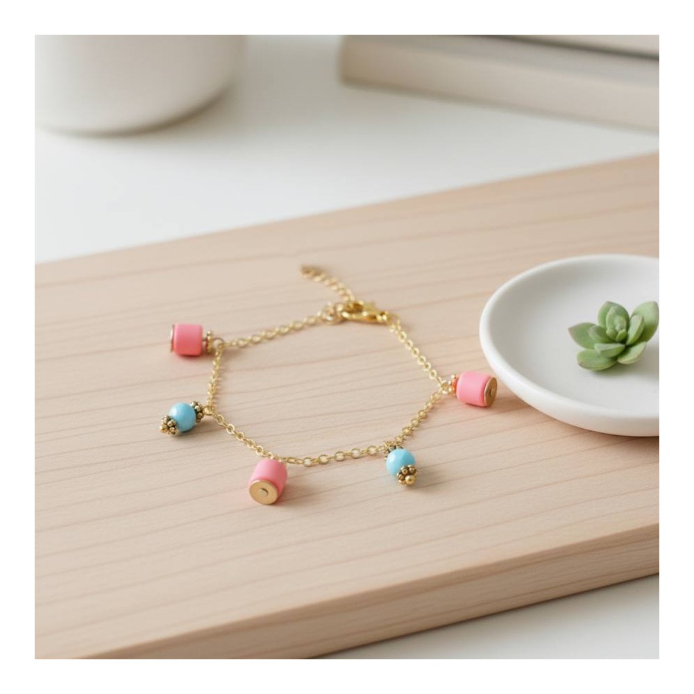 Un bracelet pétillant aux couleurs estivales ! Orné de breloques charms heishis corail et de petites perles de verre bleu turquoise.