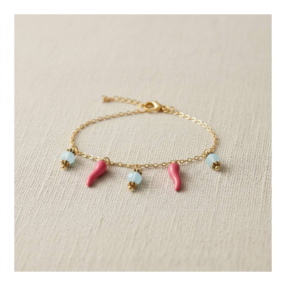 Un bracelet pétillant aux couleurs estivales ! Orné de breloques charms piments rose fuchsia et de petites perles de verre bleu ciel.