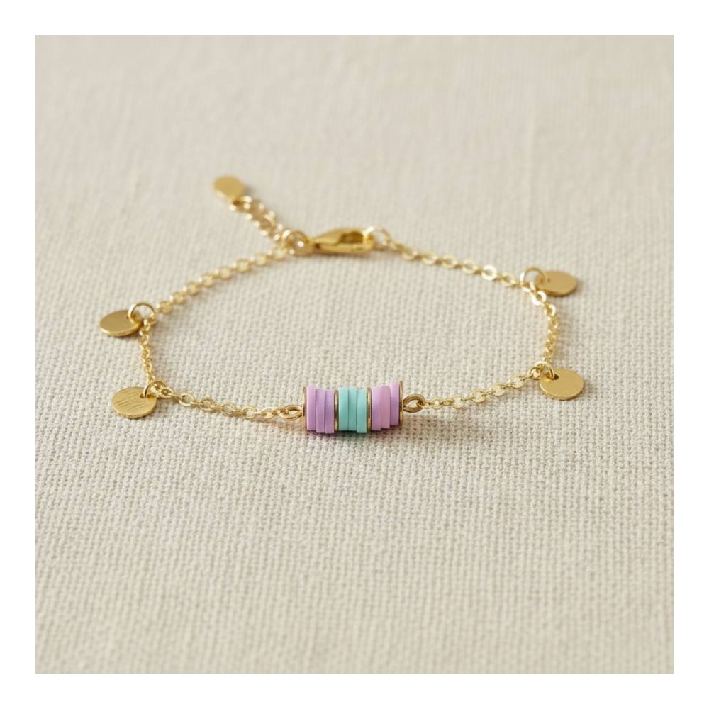 Un bracelet pétillant aux couleurs estivales ! Orné de breloques charms heishis turquoise et lilas et de petites pampilles dorées.