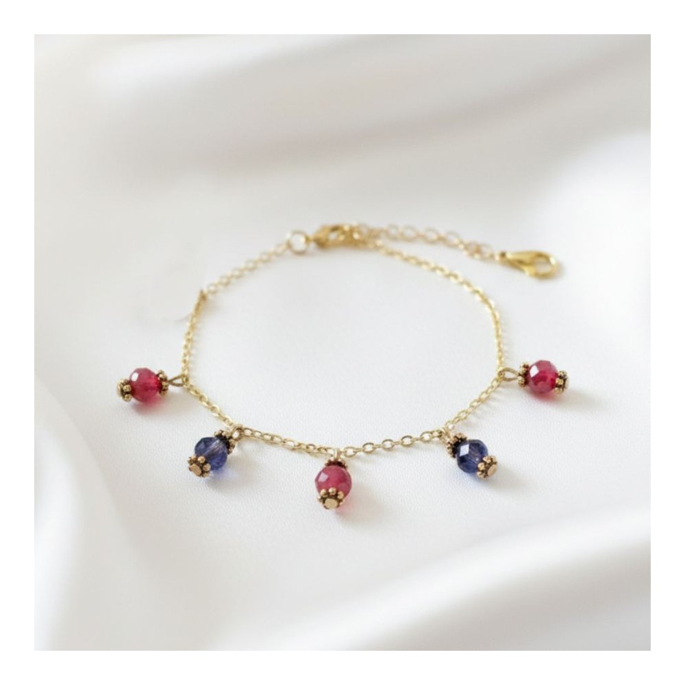 Un bracelet pétillant aux couleurs estivales ! Orné de breloques charms en perles de verre rouge et violet.