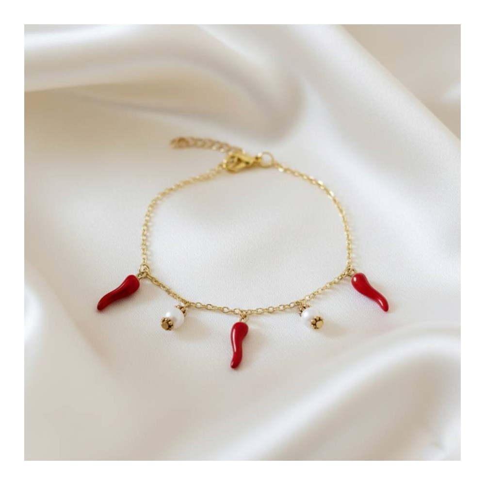 Un bracelet pétillant aux couleurs estivales ! Orné de breloques charms piments rouge et de petites perles de verre blanches. Un air de Pays Basque qui sent bon les vacances !