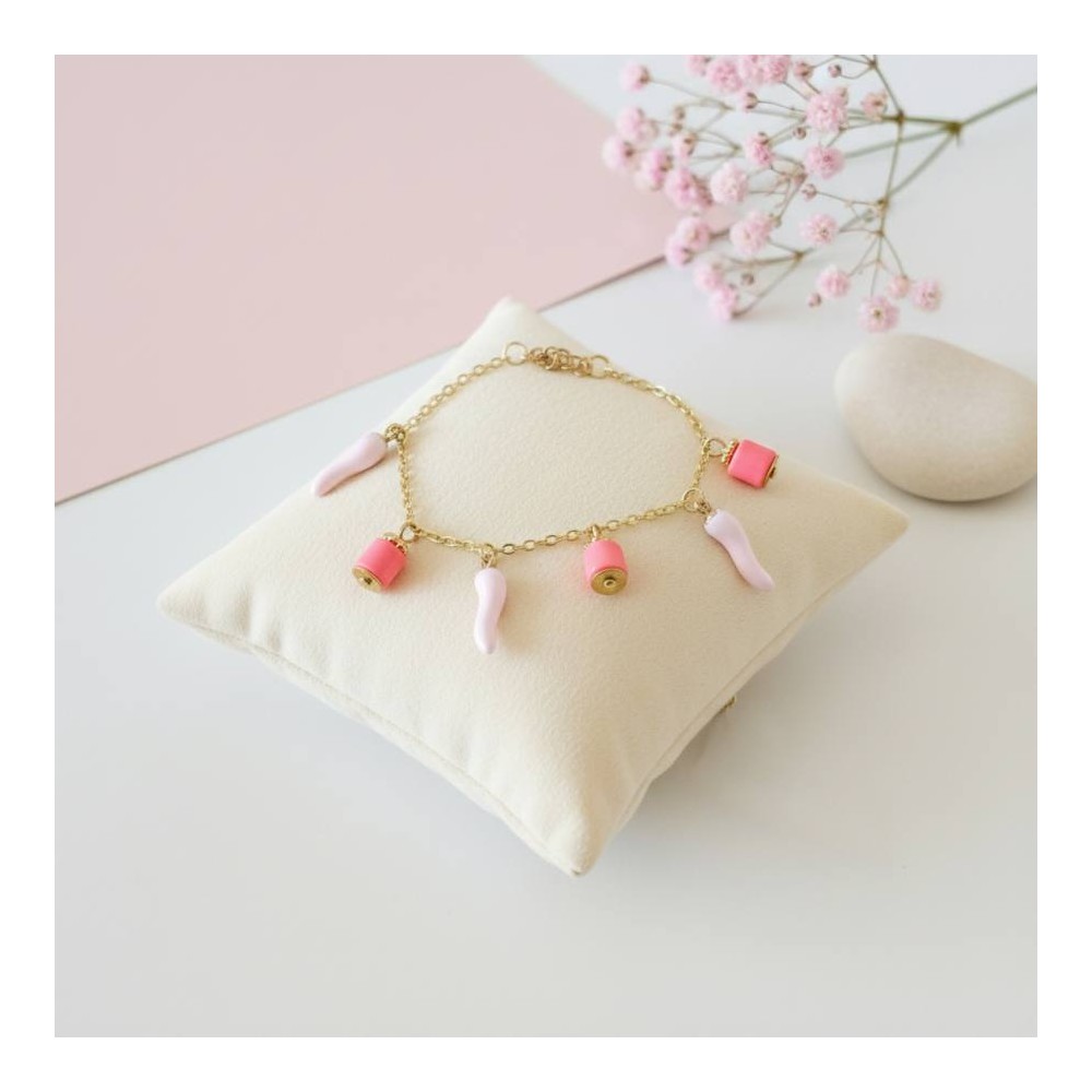 Un bracelet pétillant aux couleurs estivales ! Orné de breloques charms heishis corail et de petits piments rpse pâle