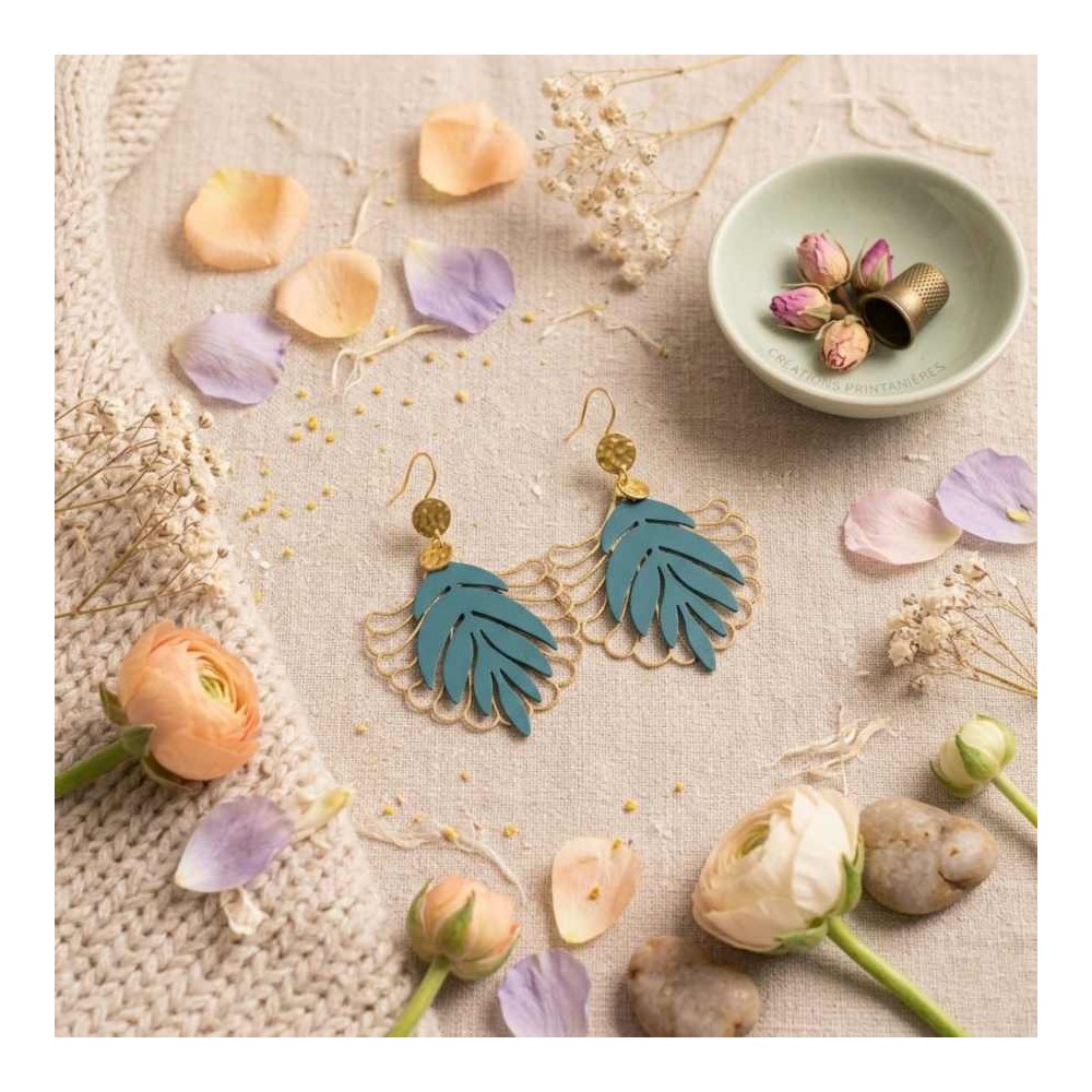 - ♡ Boucles en laiton plaqué or, feuille en métal teint et éventail en laiton plaqué or