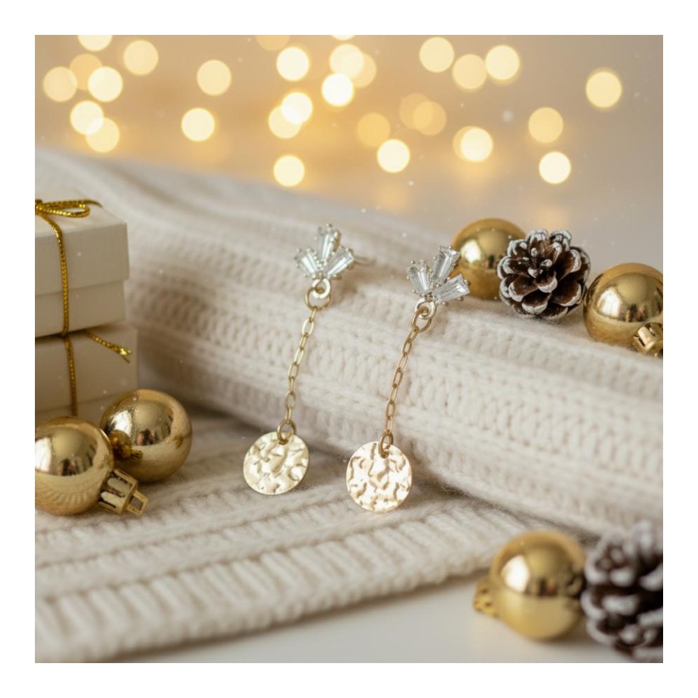 Chaque boucle d'oreille est ornée de trois élégants zircons scintillants qui captent la lumière, suivi d'une fine chaîne dorée menant à un disque texturé, évoquant un doux mouvement. Leur design intemporel les rend idéales pour offrir ou pour se faire plaisir.