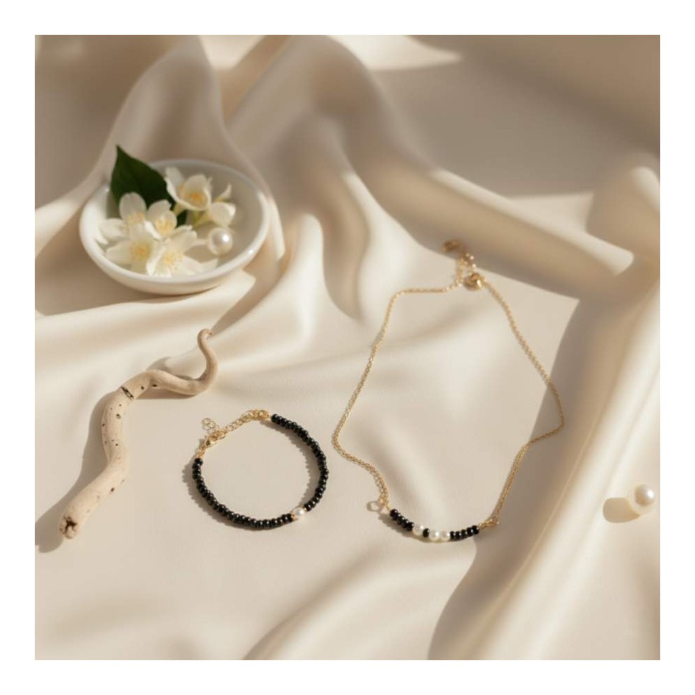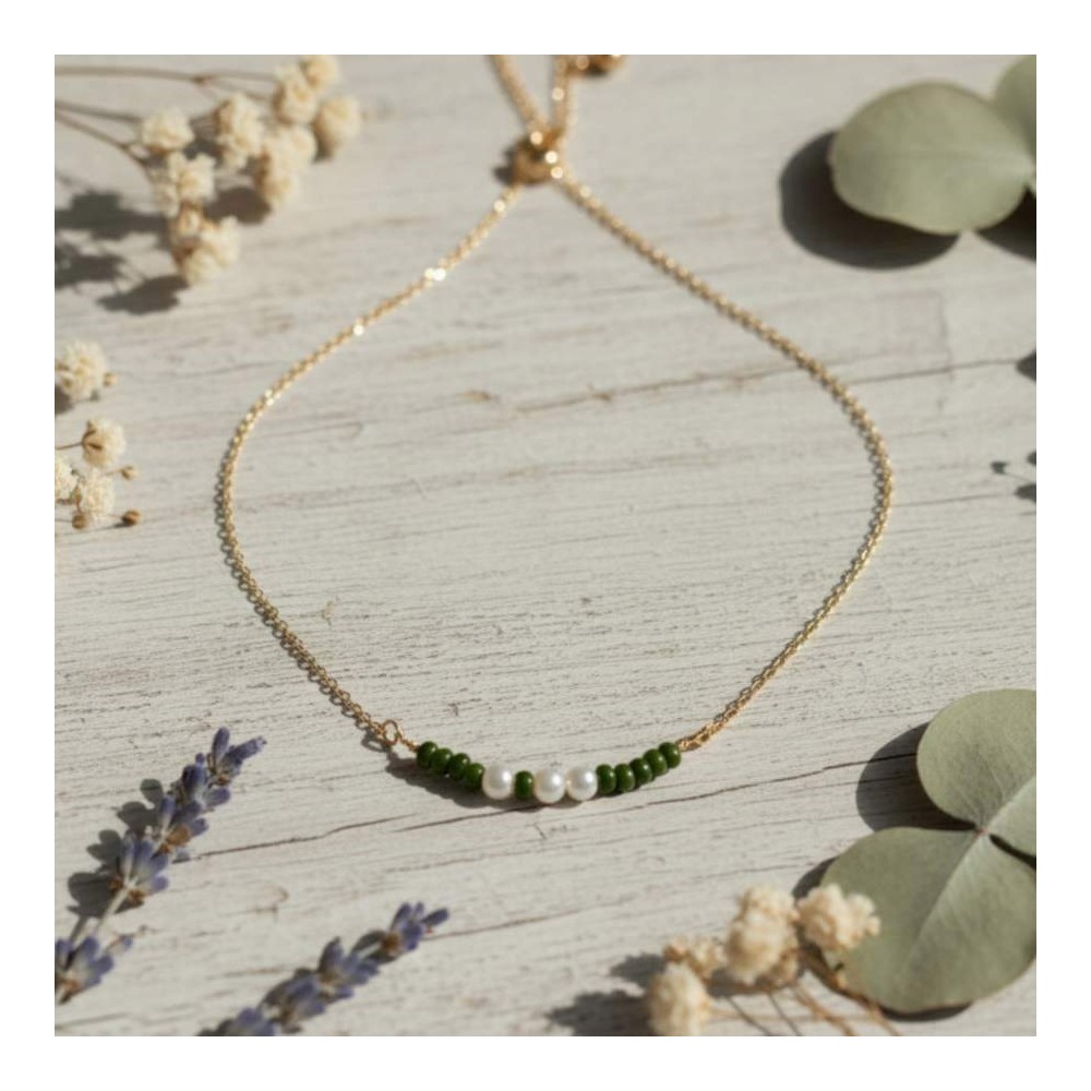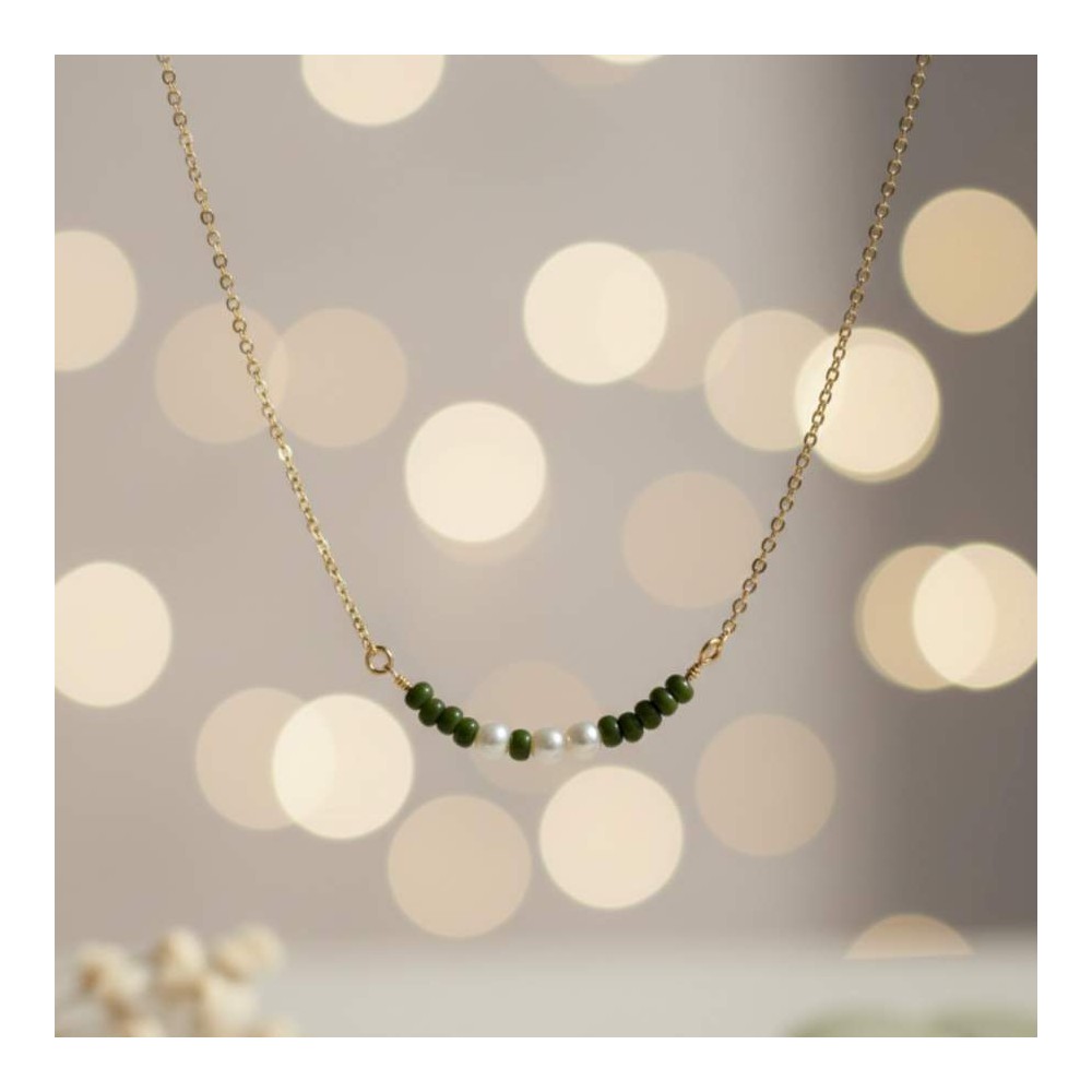Laissez-vous charmer par le Collier Selva des perles d'eau douce d'un blanc pur, symboles de sagesse et de calme, sont délicatement équilibrées par des perles de rocaille d'un vert kaki profond. Cette combinaison crée un contraste doux et captivant, rappelant les sous-bois secrets et la lumière filtrée à travers les feuilles.