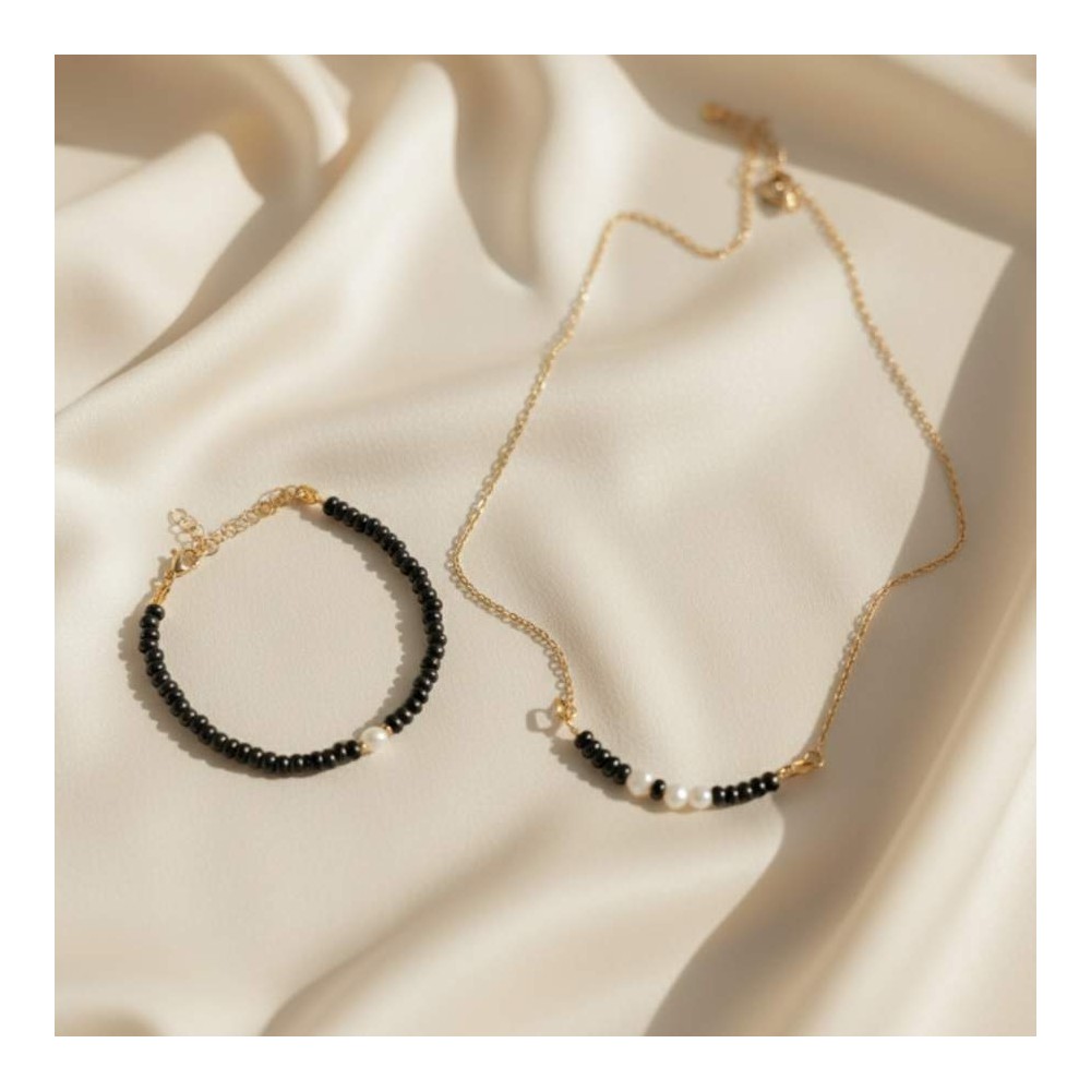 Ce bijou unique combine la douceur intemporelle de la vértitable perle de culture et la profondeur des perles de rocaille en cristal de bohème de couleur kaki foncé.