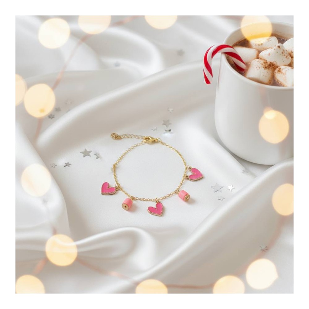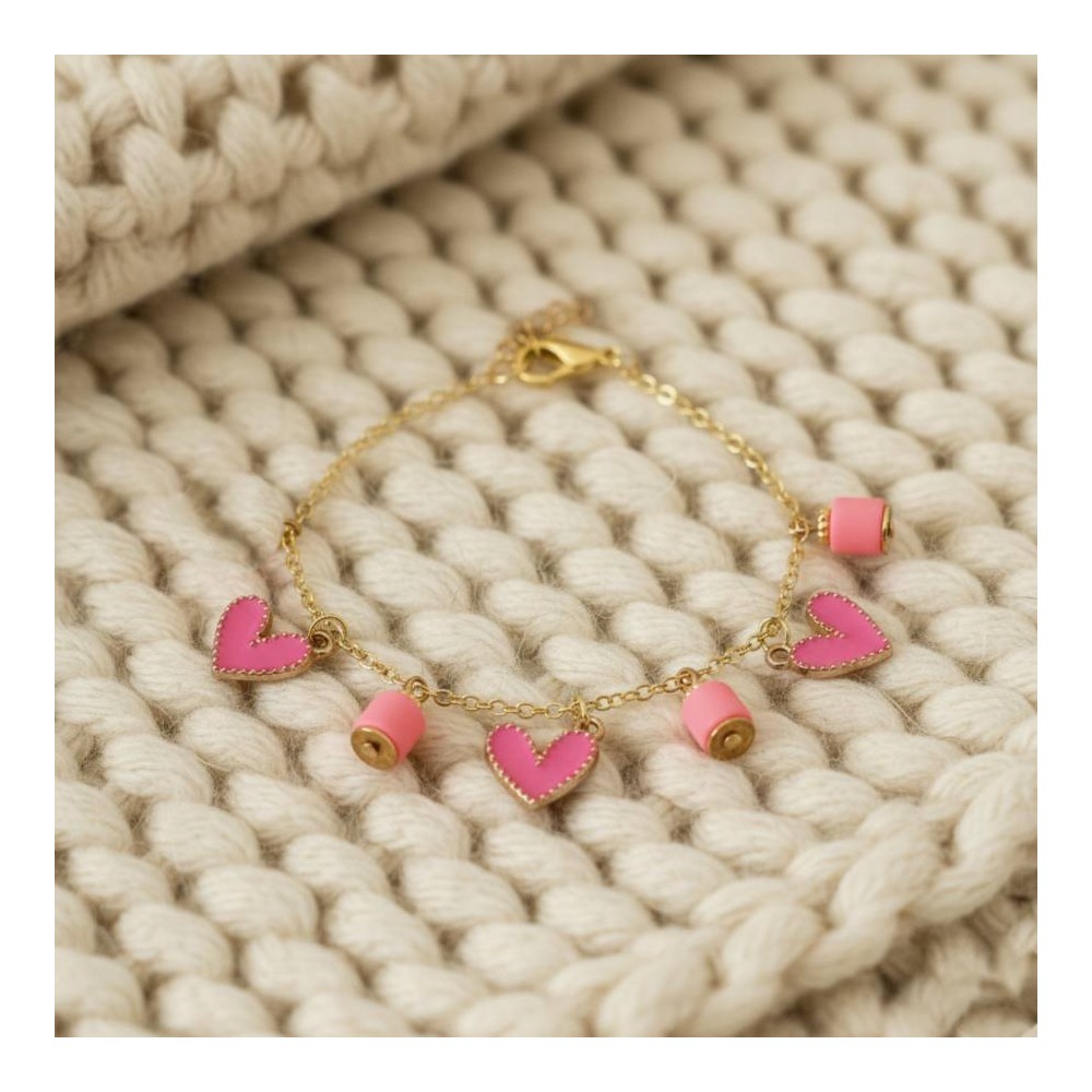 Un bracelet chic orné de charms coeurs rose fuchsia et de breloques corail, sur chaîne fine dorée