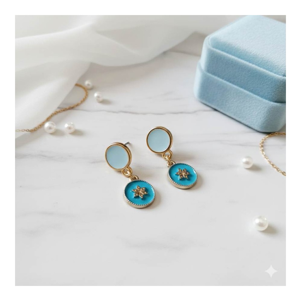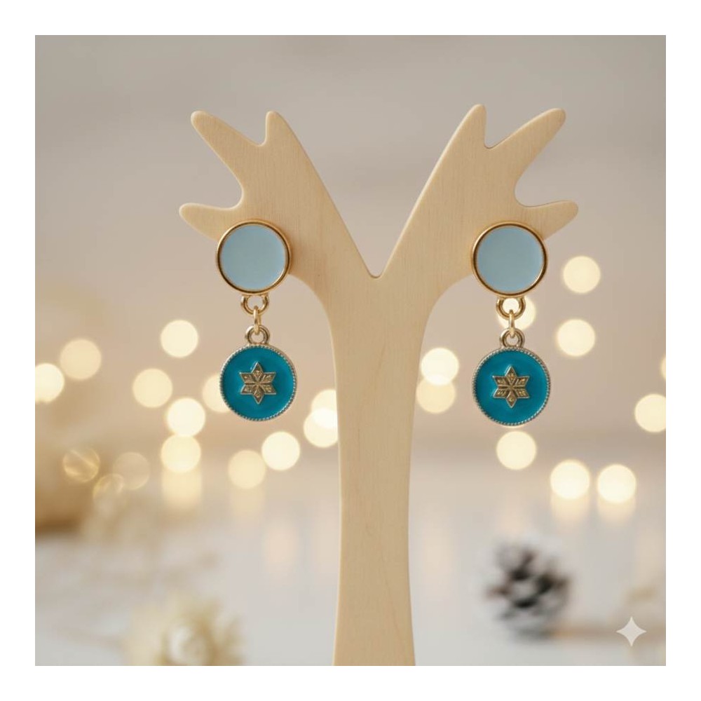 Adorables boucles d'oreille discrètes. Très peu pendantes dans les tons bleu céladon et bleu ruquoise, vous allez apprécier le pendent émaillé au discret motif doré.