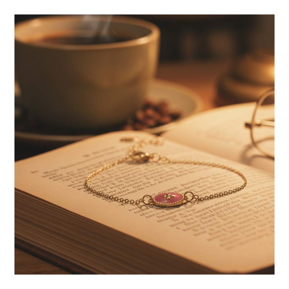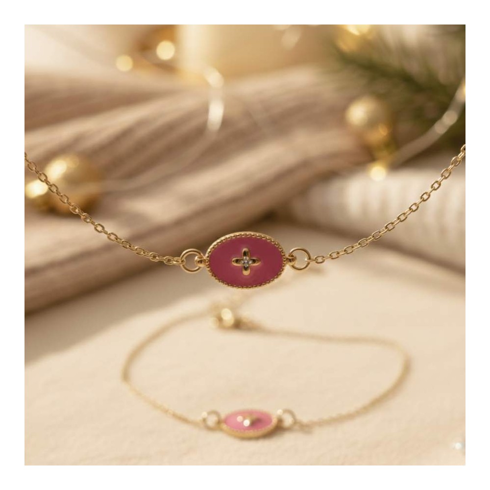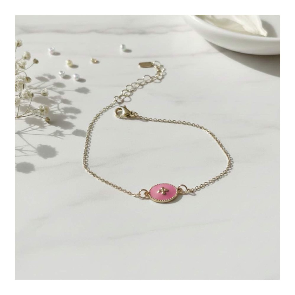 Bracelet médaillon rose émaillé doré - Bijou fin