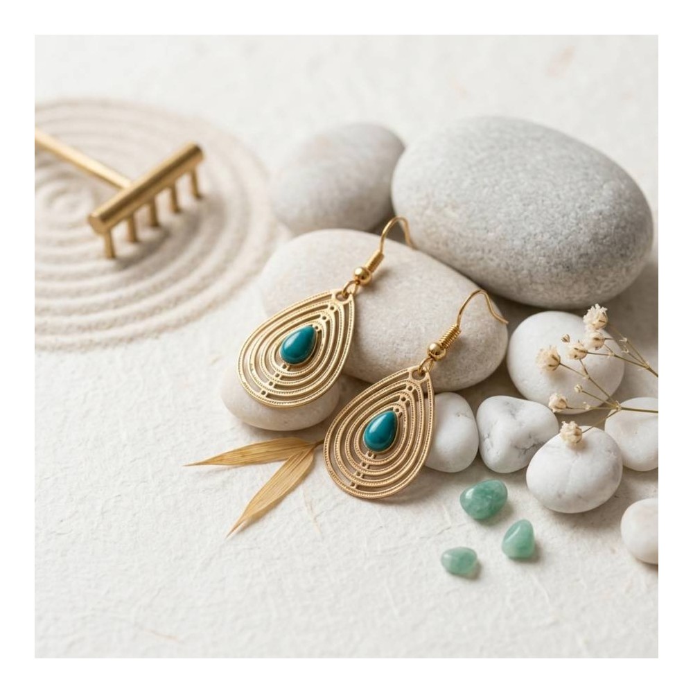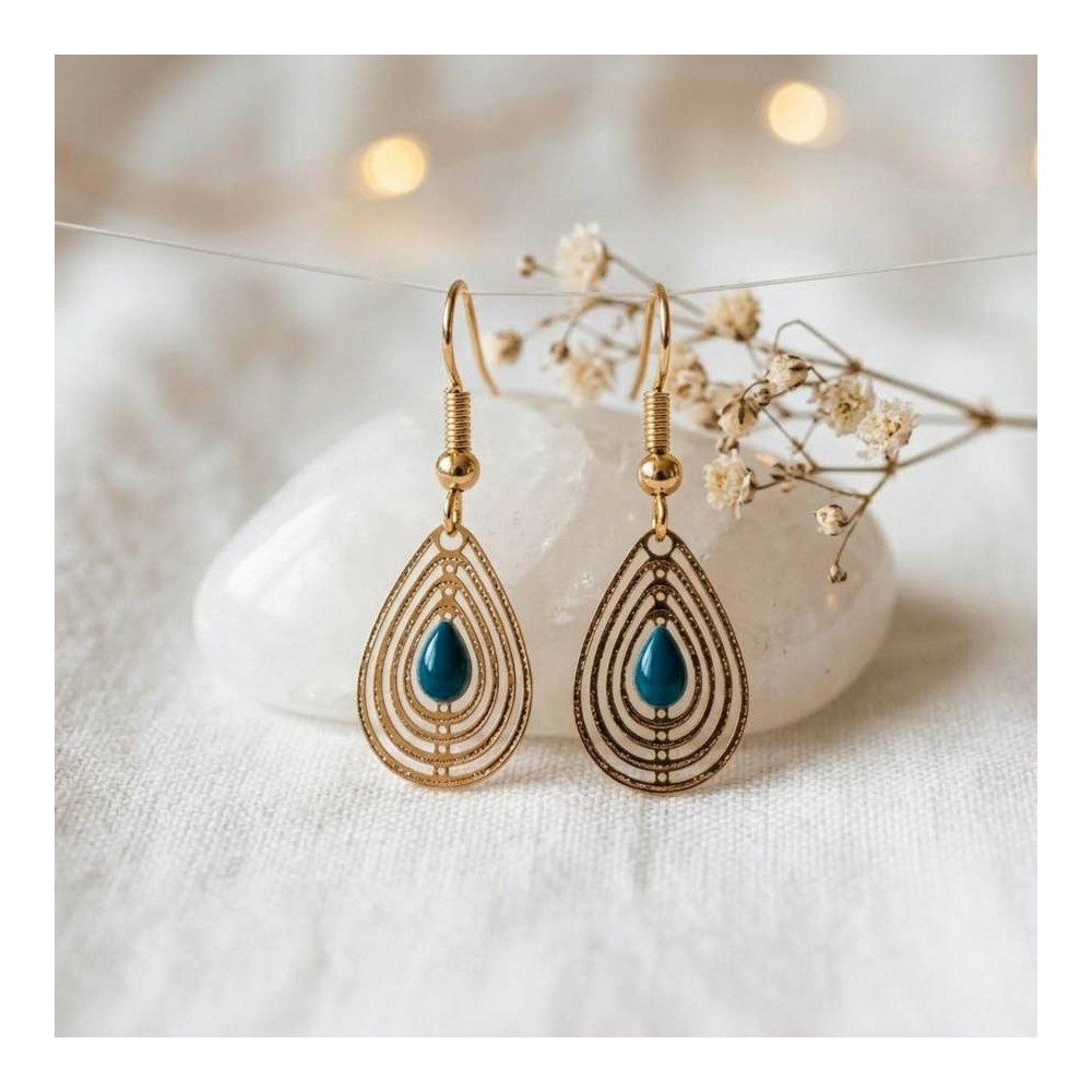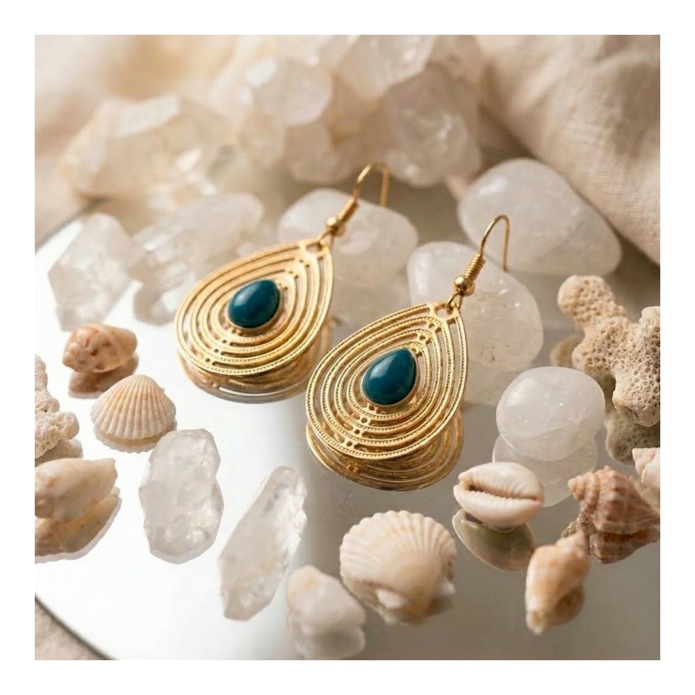 Ces boucles d'oreilles pendantes captivent par leur alliance inattendue : un pendentif goutte en filigrane doré finement ajouré, rehaussé en son centre d'un cabochon turquoise bleu turquoise d'une intensité saisissante. La géométrie concentrique du métal évoque à la fois l'artisanat ethnique et l'élégance Art Déco, tandis que la couleur turquoise apporte une énergie solaire et un caractère affirmé. Portez-les pour transformer instantanément une tenue simple en statement look.