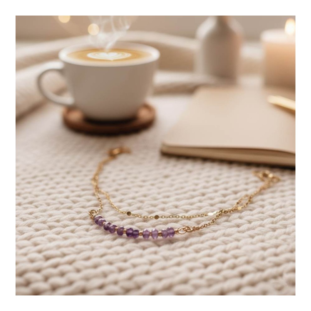 Laissez-vous séduire par notre collier double rang "Amélia", un bijou bohème chic qui apportera une touche d'élégance et de mystère à toutes vos tenues ! Ce bijou de créateur marie avec brio la finesse minimaliste à l'éclat envoûtant de l'améthyste, pour un résultat aussi tendance que raffiné.