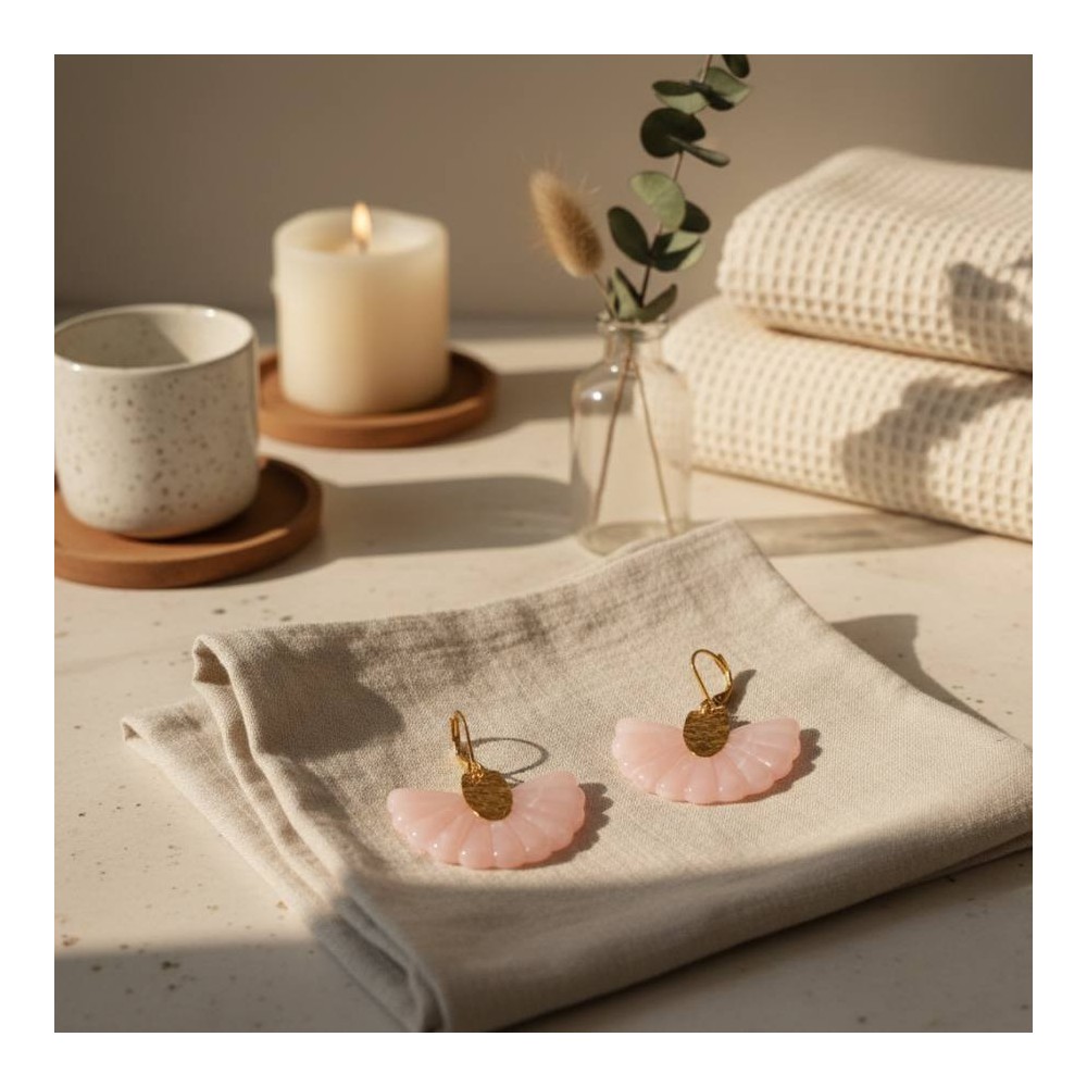 - ♡ Boucles dormeuses en acier inoxydable doré, pendent éventail en résine