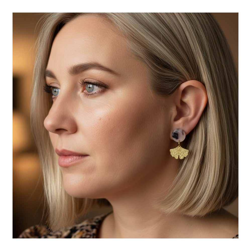 - ♡ Tiges des boucles en acier inoxydable, pendent ginkgo en laiton plaqué or, rond marbré en résine