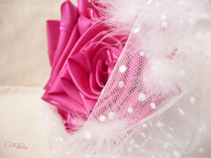 Proposer un tulle plumetis pour ajouter une touche toute romantique et personnalisée à un bouquet de mariée fuchsia et blanc (bouquet modèle Nina personnalisé)