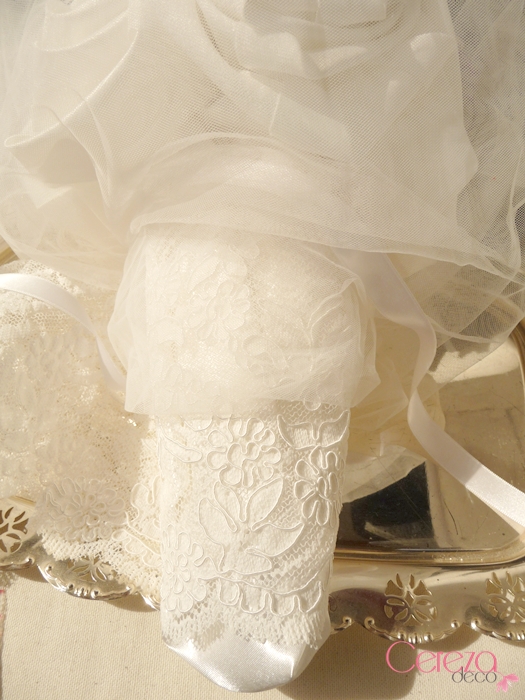 Un prototype en cours pour habiller d’une dentelle fabuleuse la tige d’un bouquet de mariée original