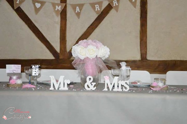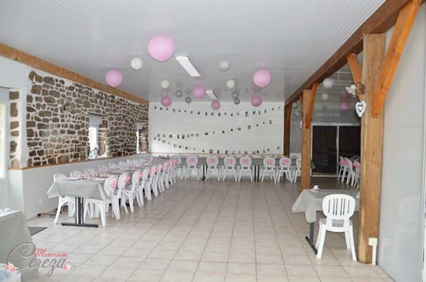 Du côté de la décoration de la salle, on retrouve dans une très jolie harmonie les couleurs rose, gris et blanc du mariage sur les tables, les chaises et en lampions de papier pour habiller le plafond.