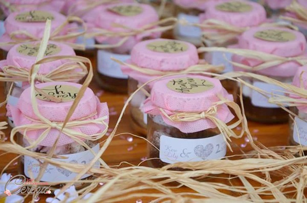 Dans de petits pots à bébés customisés, la mariée a mis 2 cuillères à soupe de cacao, 2 cuillères à soupe de sucre roux et une dizaine de mini-chamallows. Du lait chaud à jouter et les invités pourront se régaler à la maison 😉