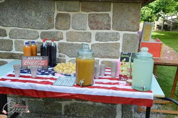 Un drapeau américain en guise de nappe, des panneaux absolument rétro et des fontaines à boisson.