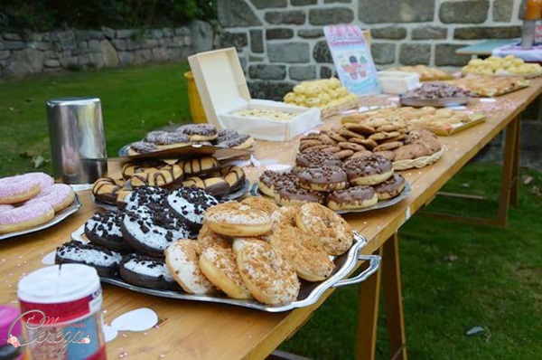 L’idée très originale à retenir : les mariés ont organisé une grande table avec tout ce qu’on peut imaginer pour un brunch typiquement vintage américain ! Toutes sortes de donuts avec différents topping, des muffins salés, mini baggels et wraps.