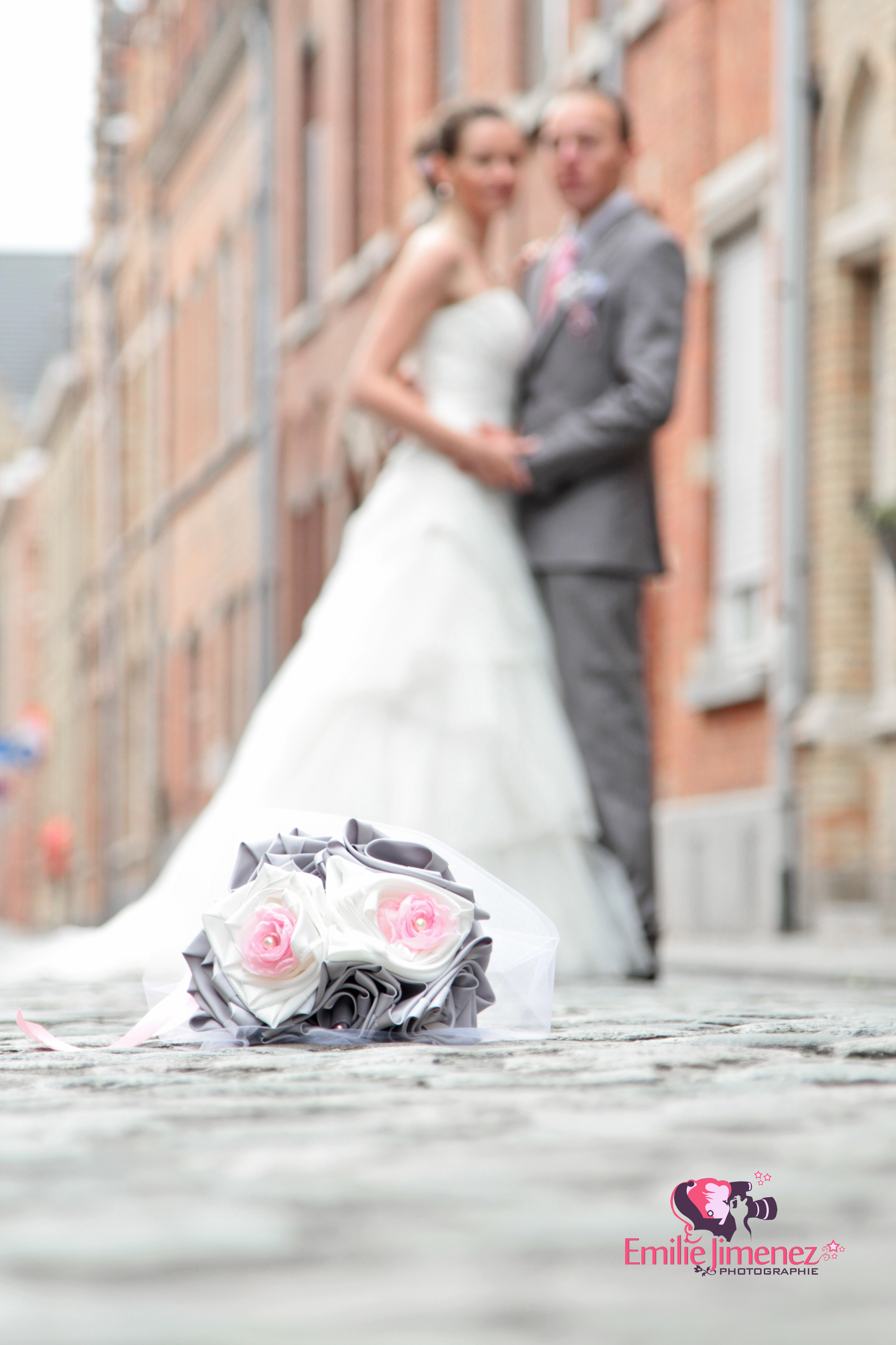 Anne-Laure et son thème de mariage rose & gris m’a confié la personnalisation de son bouquet en lin gris et touches de rose pâleAnne-Laure porte le modèle ‘Margaux’ (sans tulle) en lin gris et fleurs vaporeuses rose, perles & tulle un bouquet de mariage rose et gris