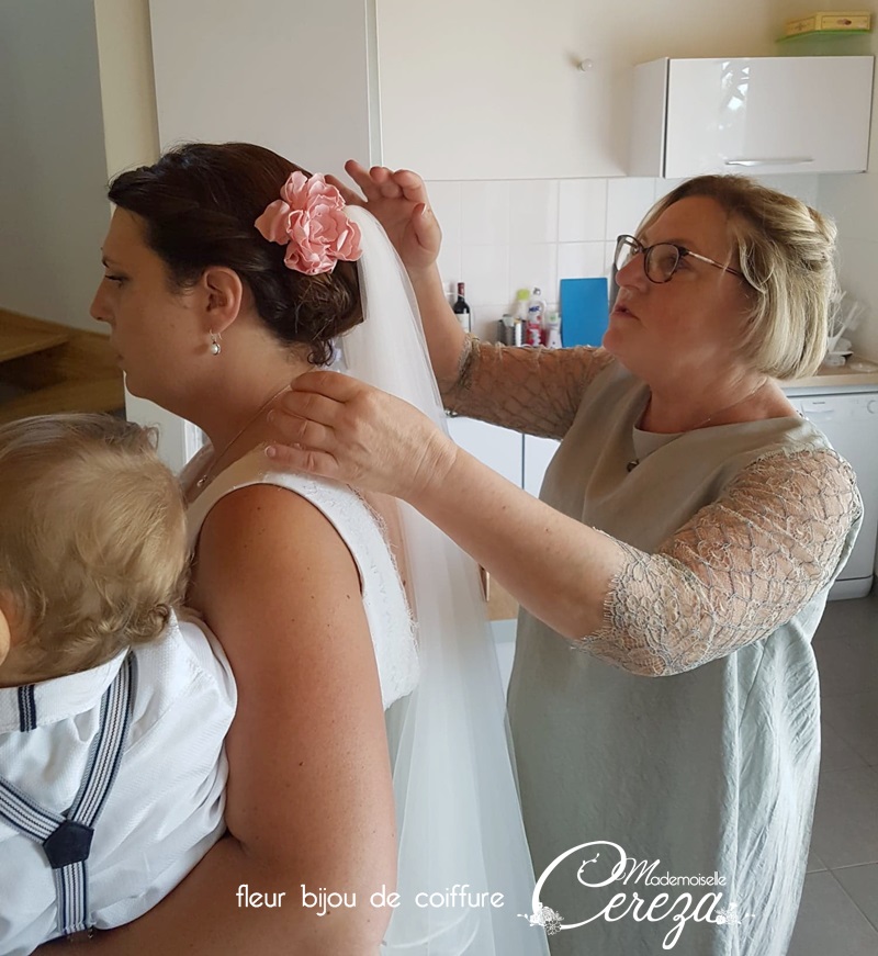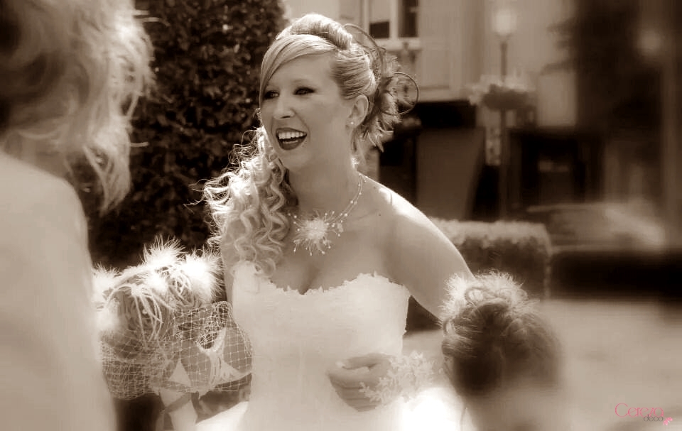 Elle m’a demandé de lui personnaliser le bouquet de pivoines de plumes (le modèle Pivoine) dans un dégradé de tons ivoire, rose pâle et vieux rose, de souligner le côté bijou du bouquet en ajoutant plus de détails de perles. J’ai également posé une voilette pour un côté rétro chic absolument fabuleux. Une très belle et pétillante mariée Mademoiselle Cereza !