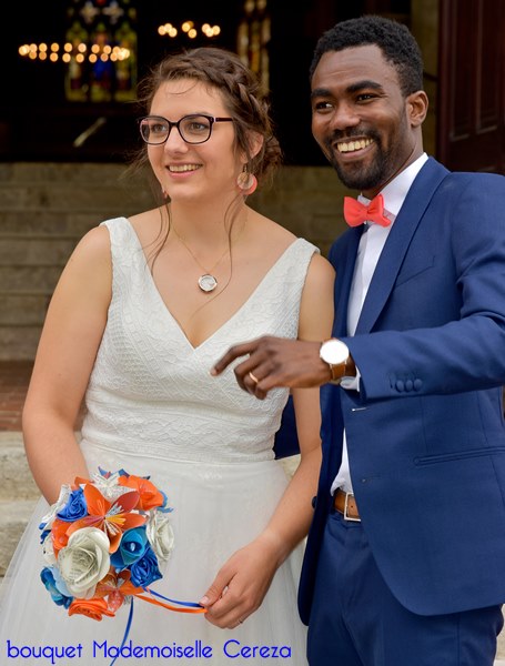 Caroline et son amoureux, et son bouquet de mariée origami sur-mesure (fleurs de papier + fleurs de satin) orange et bleu