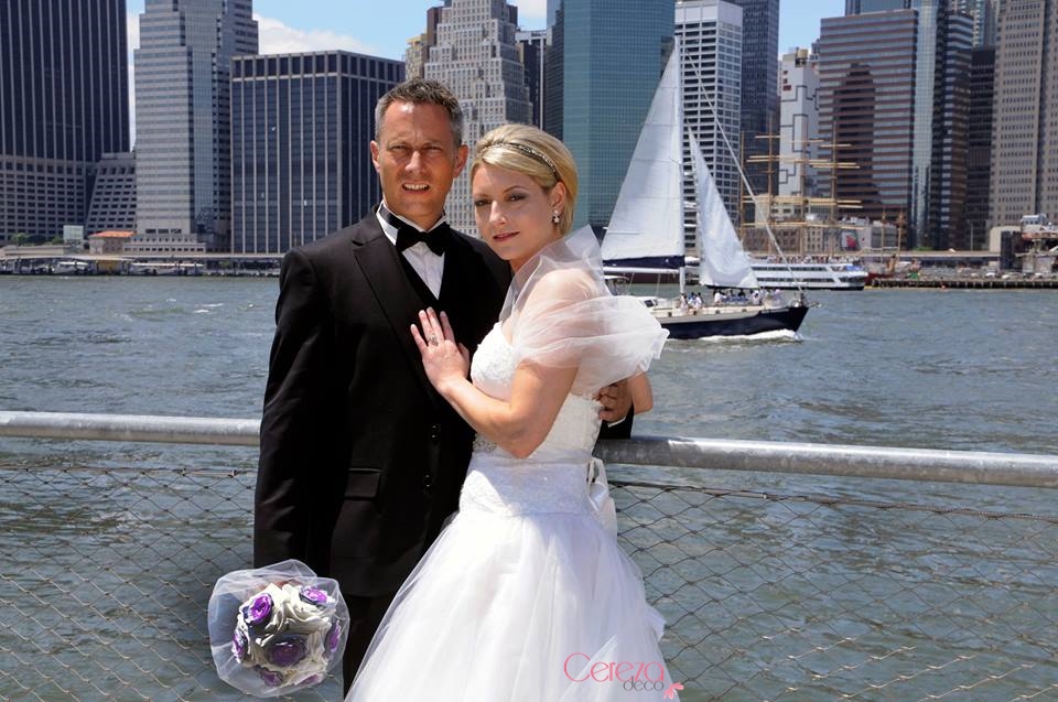 Céline, pour son joli jour à New York, porte le bouquet bijou Louise en dentelle de Calais, satin & cristal Swarovski