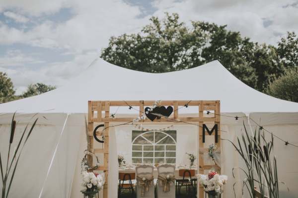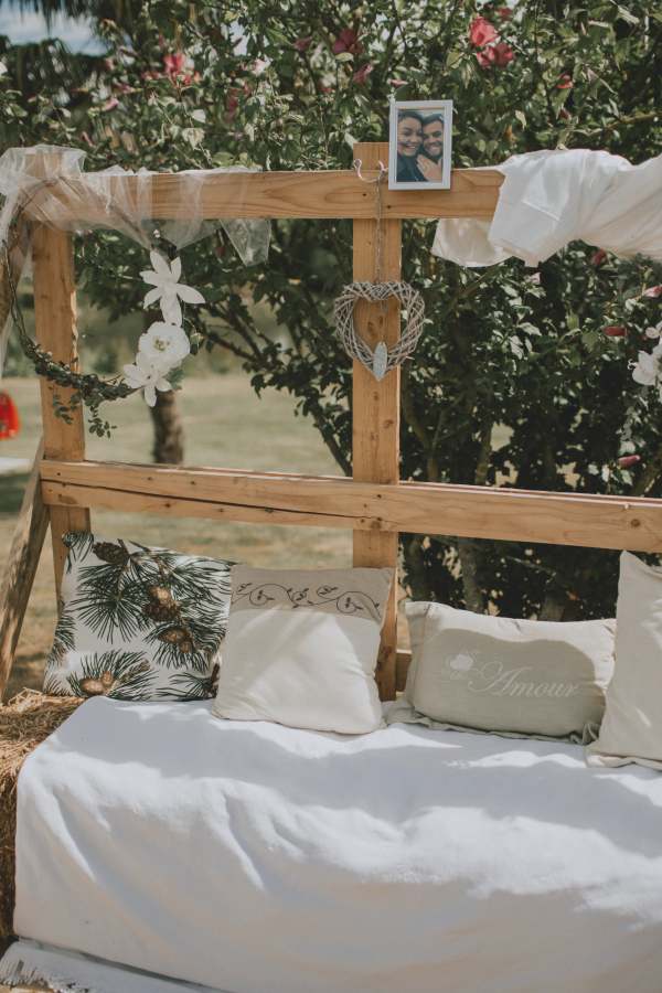 De même qu’ils nous ont fait plusieurs surprises : fabriquer l’arche à l’entrée du barnum avec nos initiales, le décor photobooth champêtre et un bar en palette avec la tireuse à bière pour l’après-midi et la soirée.