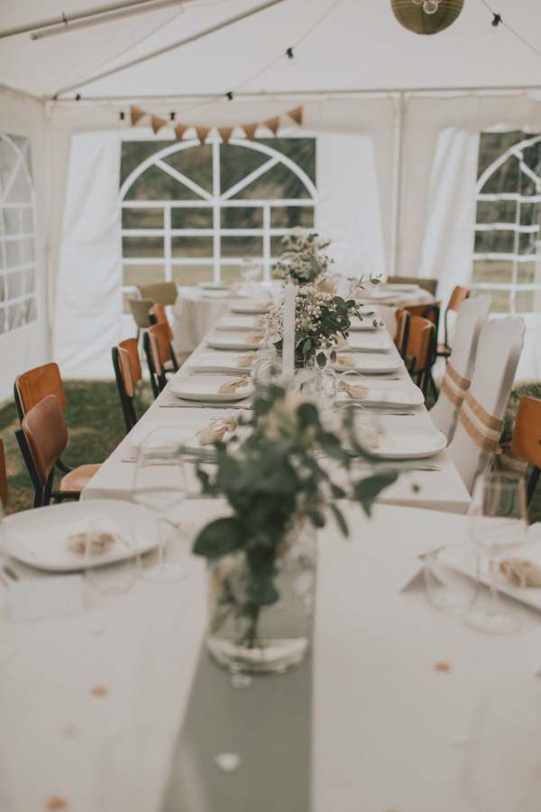 Mes beaux-parents étaient déjà équipés donc nous avons utilisé leur barnum, leurs tables et leurs chaises. Niveau vaisselle, nos parents respectifs nous ont prêtés leur assiettes et verres (vaisselle blanche, sobre, efficace, merci IKEA ).