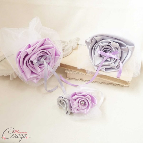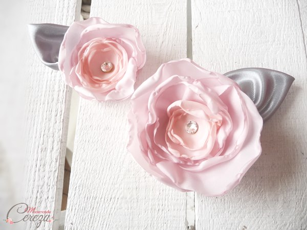 Une proposition envoyée à la future mariée de bijoux de coiffure floraux sur-mesure en rose poudré et gris, agrémentés de cristaux Swarovski, avec une version pour enfant et une version pour femme.