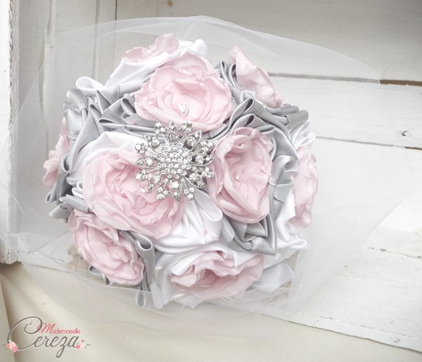 La 2ème version du bouquet rose poudré, gris et blanc et sa broche bijou, un bouquet plus sobre sans plumes :