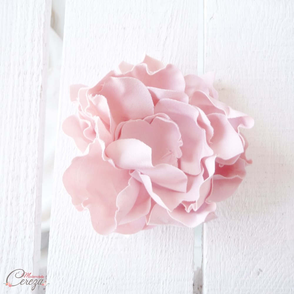 J’ai reçu une jolie demande d’accessoire de coiffure de la part de Julie, future mariée du mois de juillet. Elle souhaitait que je lui confectionne une fleur rose poudré ou blanche pour accessoiriser sa coiffure. Julie m’a demandé de lui créer une pivoine dans un tissu naturel et non brillant. J’ai donc laissé de côté le satin et j’ai choisi deux tissus de coton pour créer des pivoines absolument divines ! Voici ce que j’ai proposé à la future mariée