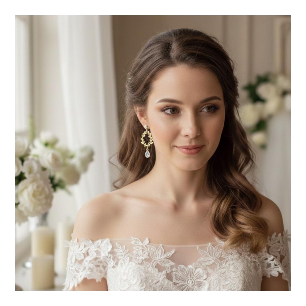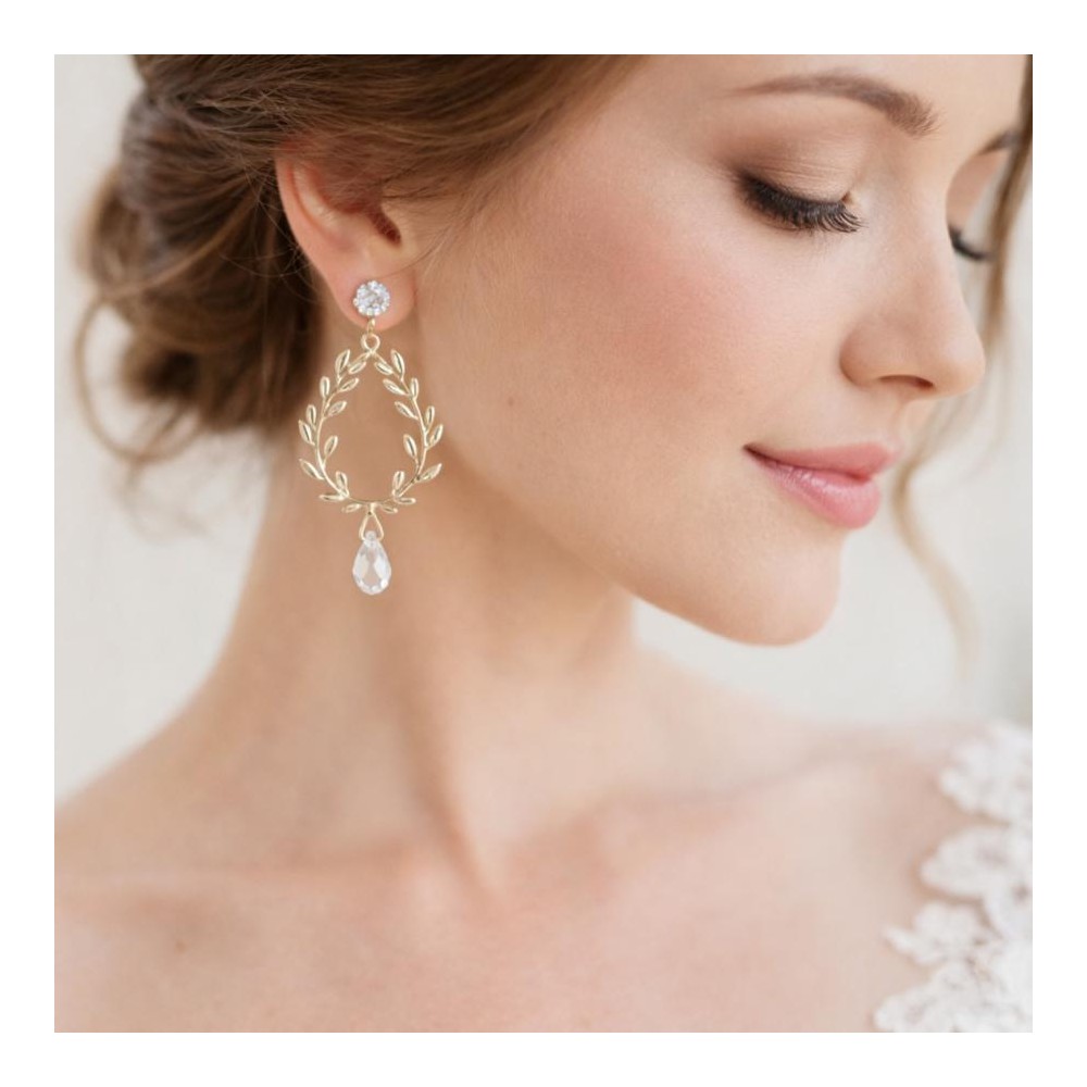 Les boucles de mariée "Shana" le bijou au feuillage tendance bohème chic par excellence ♥ Une couronne de feuilles d'olivier montée sur une boucle d'oreille au solitaire de cristal. Le détail chic, un cristal Swarovski en forme de goutte vient ajouter la touche d'élégance en plus aux boucles.