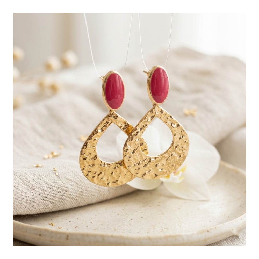 Laissez-vous envoûter par ces boucles d'oreilles pendantes au caractère bohème affirmé. Une cabochon ovale en émail rose foncé serti dans une monture dorée couronne un grand anneau goutte en métal martelé, dont chaque facette capte la lumière.