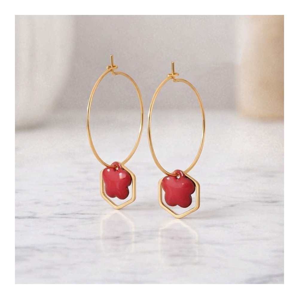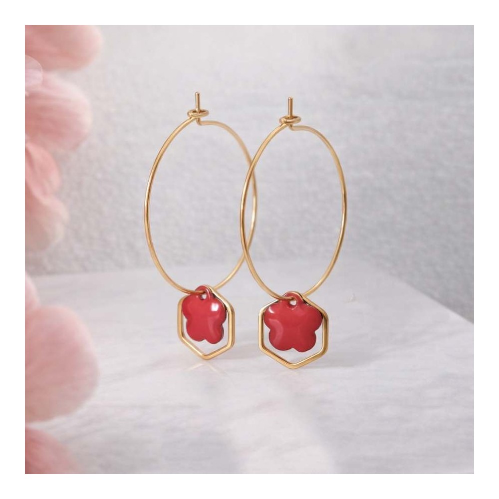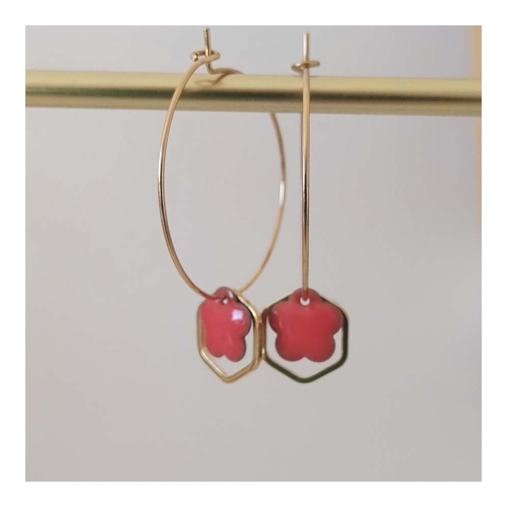 - ♡ Créoles en acier inoxydable plaqué or, fleur corail en émail, pendentif en laiton plaqué or