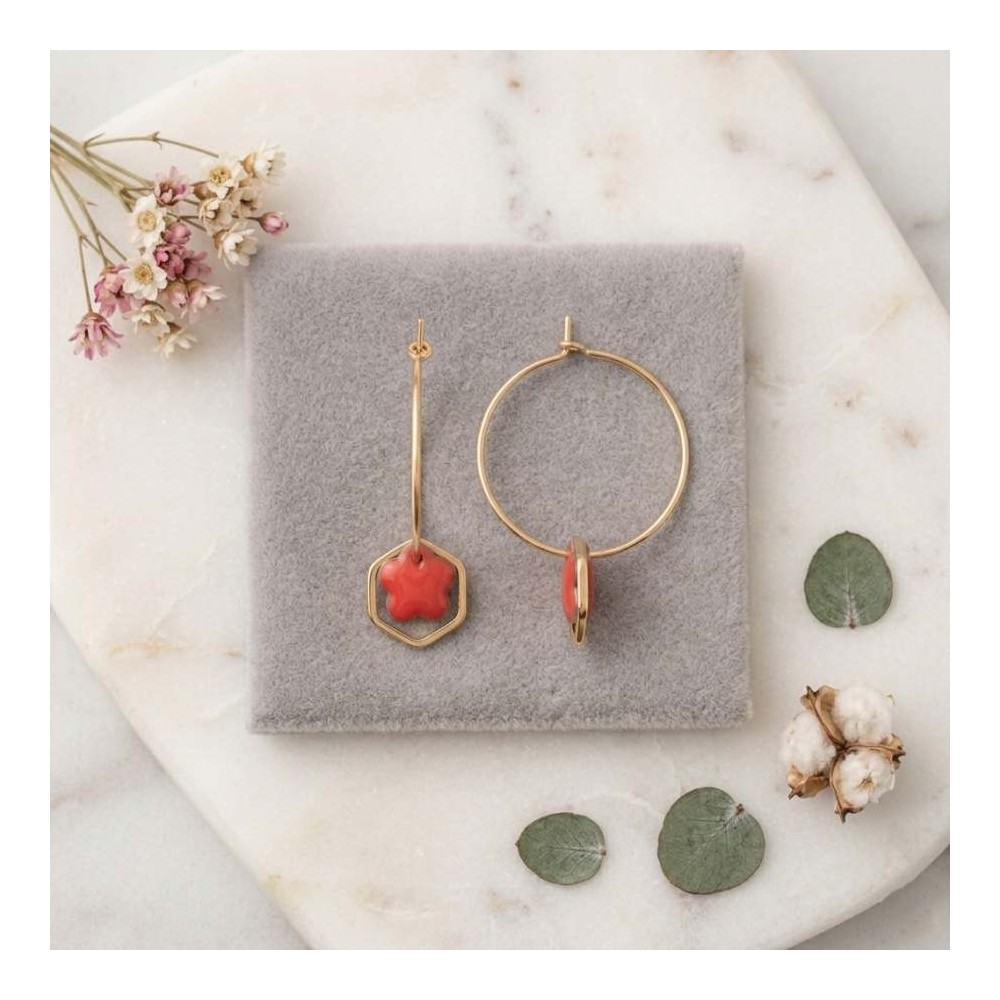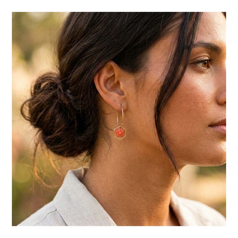 Une créole fine dorée, une fleur corail qui se glisse dans un hexagone géométrique : ces boucles jouent sur les contrastes avec une légèreté évidente. Portées seules ou en mix, elles relèvent aussi bien un look casual qu'une tenue du soir.