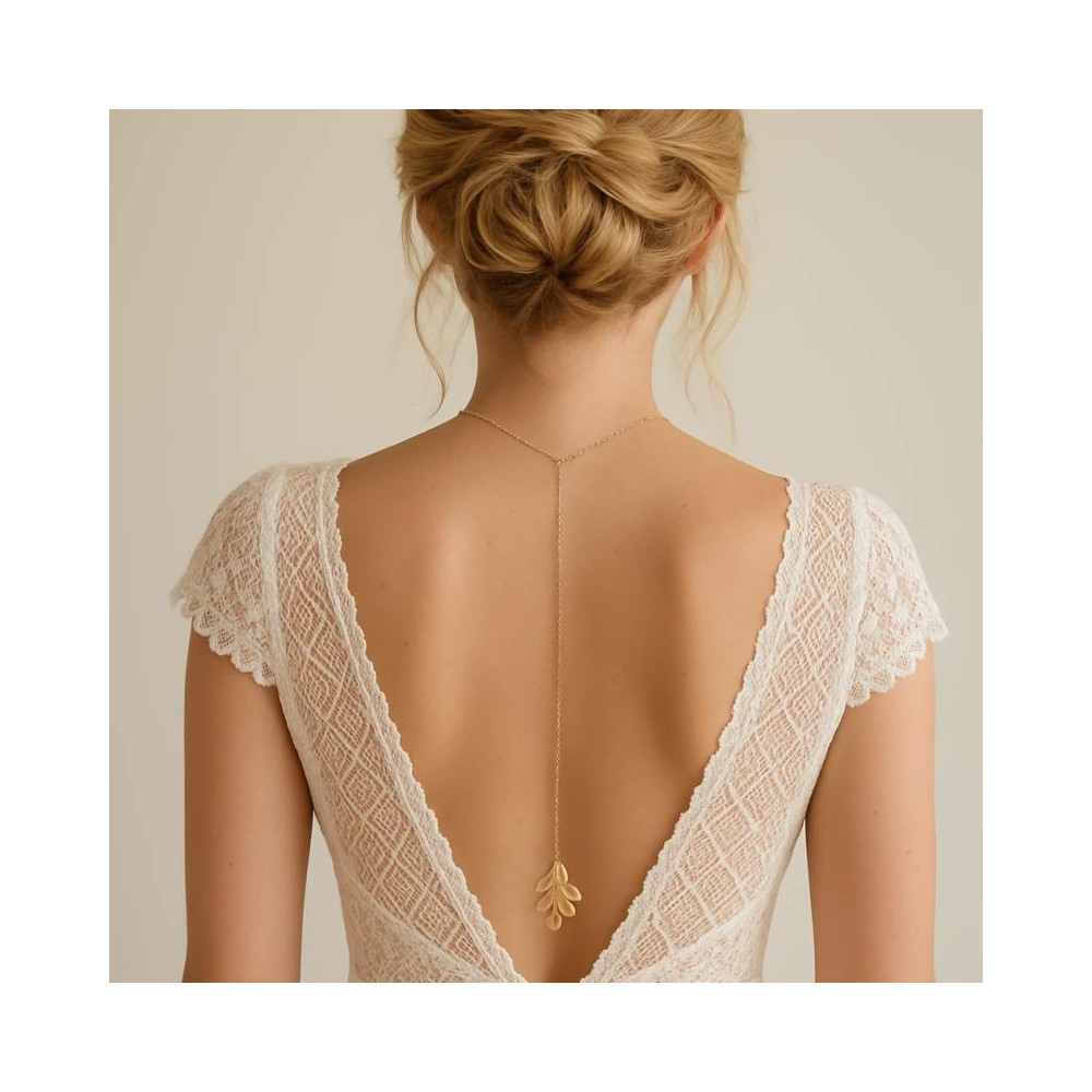 Collier dos nu doré champêtre chic pour robe de mariée dos nu feuille "Ainoha" Bijou mariage personnalisable