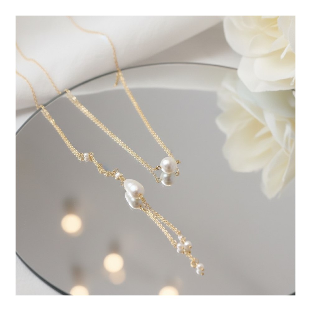 Le collier de dos peut être coordonné aux boucles d'oreille perle goutte Léanor, au bracelet de perles Mina, ainsi qu'au headband perles Lili.
