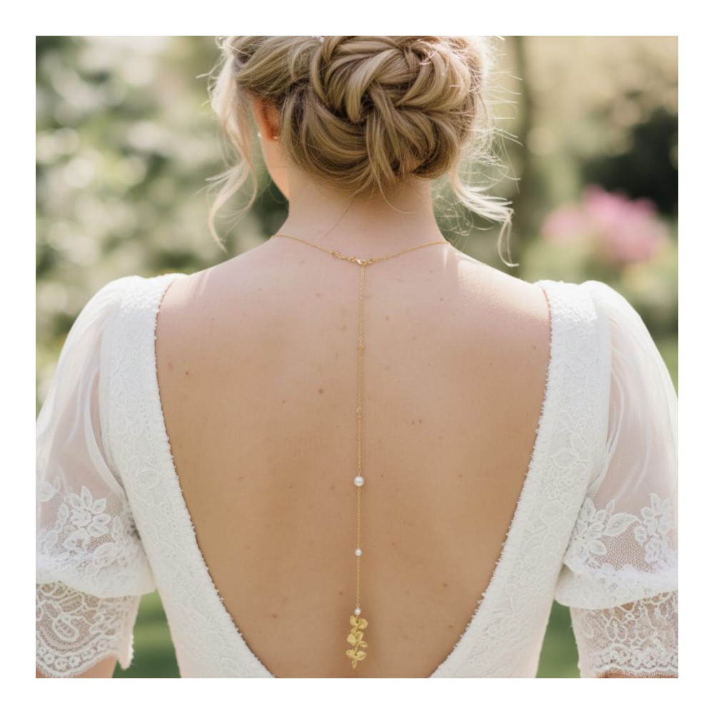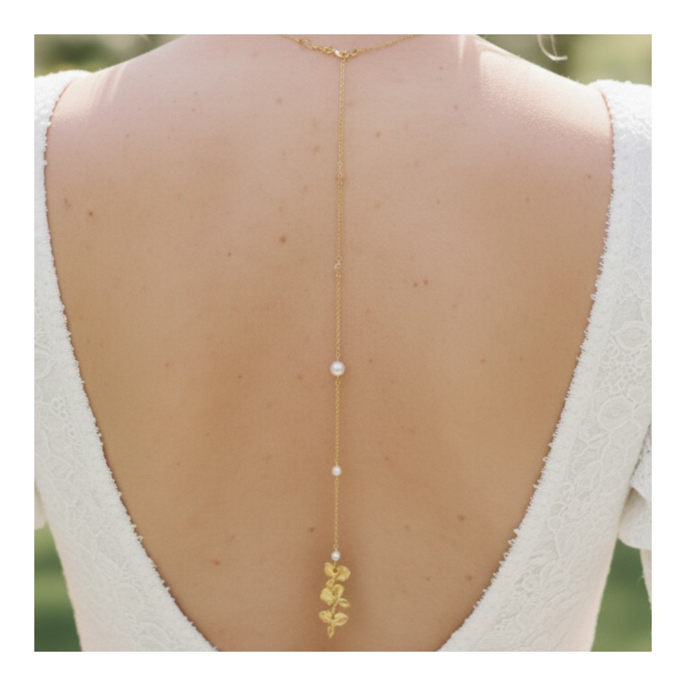 Le collier de dos est composé de 3 petites fleurs et de perles nacrées pour un joli mouvement. Sur l'avant du collier de dos vient se placer une petite perle ronde tout en simplicité.