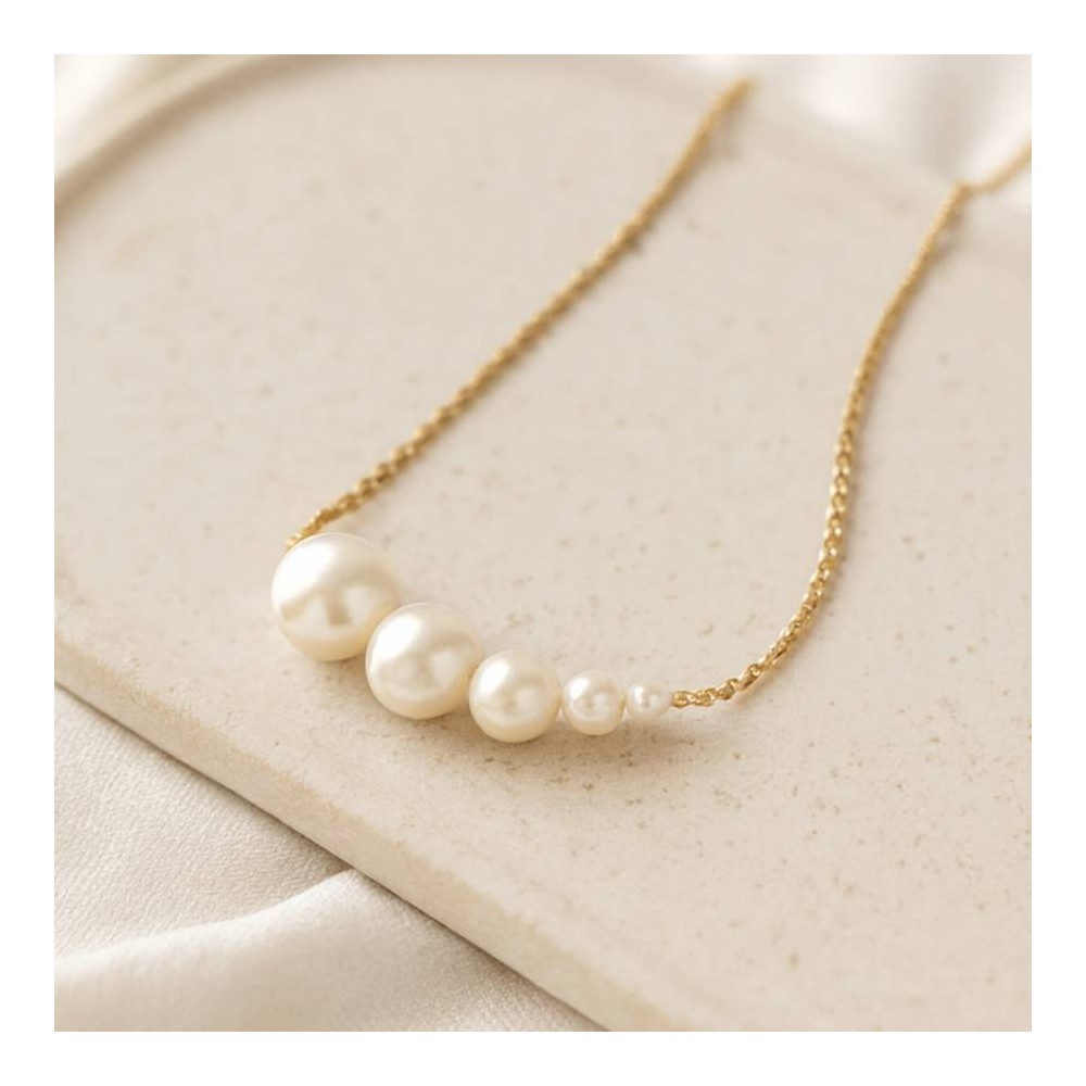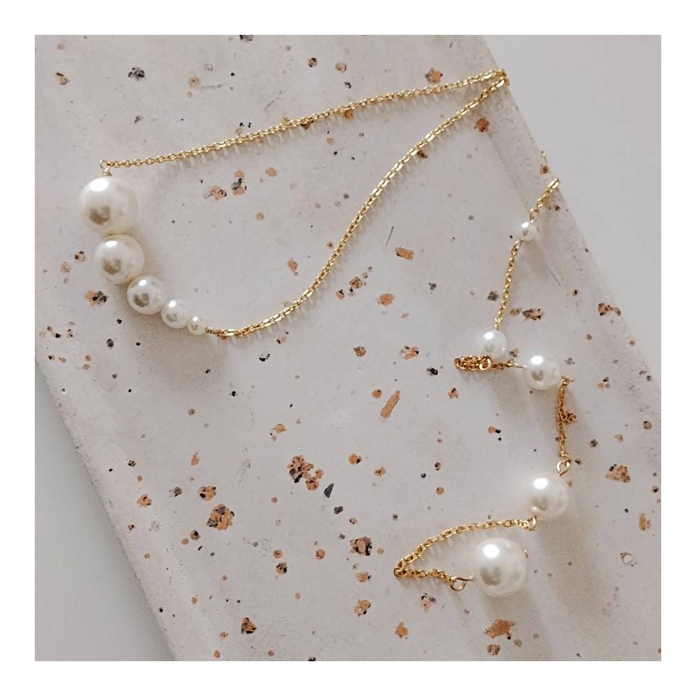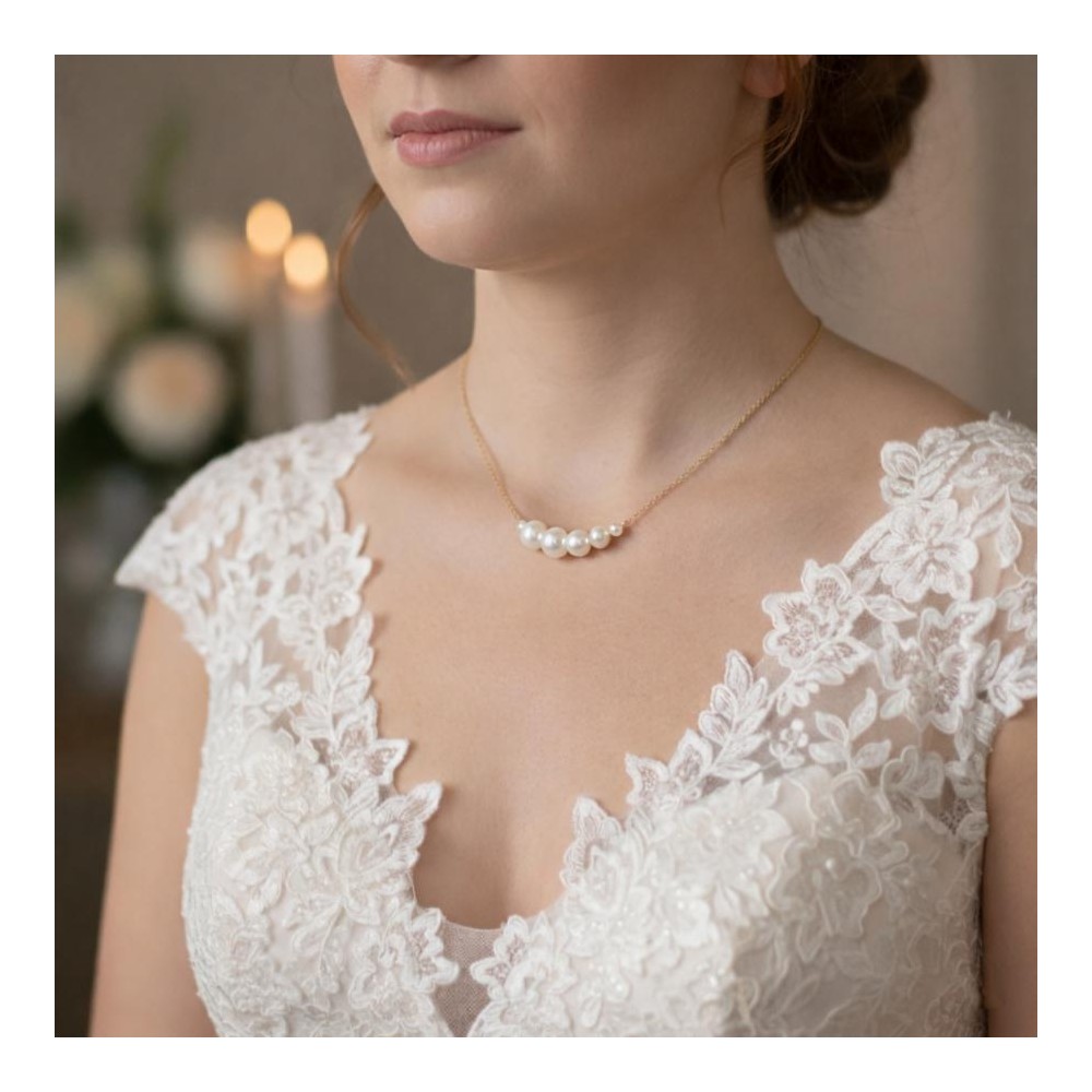 Le collier de dos est composé d'un pendentif de dos composé d'une cascade de 5 perles nacrées dont vous choisissez la longueur pour qu'il tombe parfaitement avec votre décolleté de dos. Sur le devant du collier ce sont également 5 perles reprises pour une élégance intemporelle.