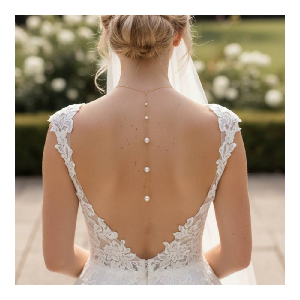 Le collier de dos de mariée mesure 42 cm de tour de cou, vous choisissez la longueur du pendent de dos dans les options. Le pendentif de dos est amovible : vous pourrez facilement l'enlever ou le remettre